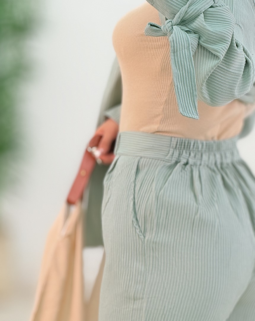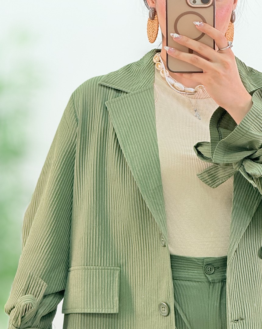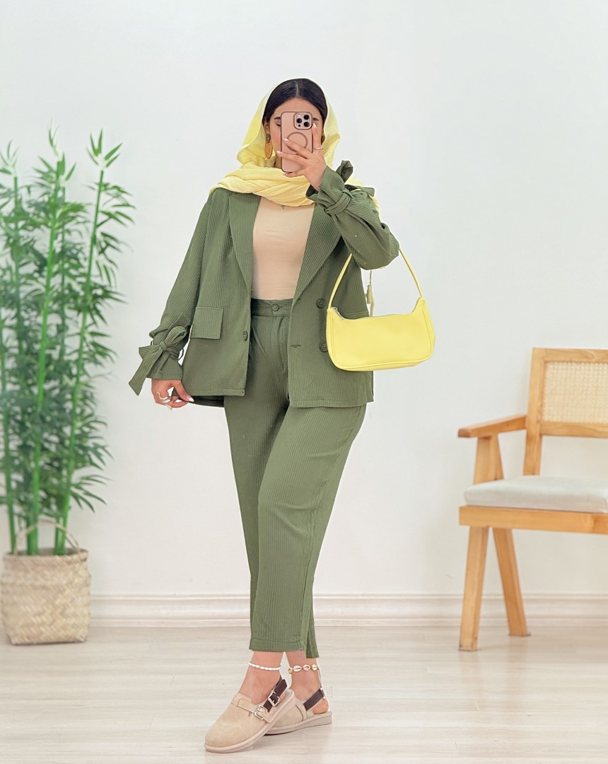 ظاهری:یقه انگلیسی،جیب نما، مچ دارای بند،دکمه نما / شلوار:مام،دکمه و زیپ،جیب